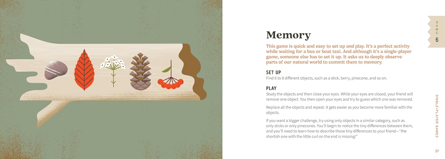 The featured games are grouped into single-player, two-player, and multiple-player options, with a focus on setups similar to the ever-popular board games people enjoy playing at home. From Nine Men’s Morris to Stick Solitaire to Neanderthal Poetry, every game has been vetted by the author and her family and friends in outdoor settings.